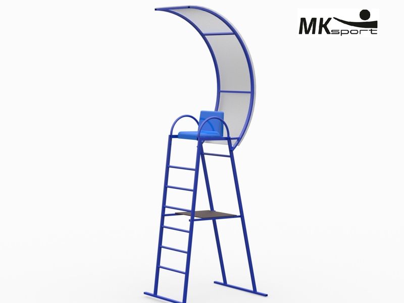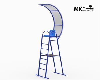 Универсальная судейская вышка для уличного пользования. Положение судьи сидя. Каркас изделия изготовлен из профильных труб 40*25*2 и 27*3 мм. Козырек обшит сотовым поликарбонатом 8 мм. Высота вышки без учета козырька – 2,3 м. Для хранения инвентаря предусмотрена полка из ламинированной фанеры. Вышка оборудована пластиковым креслом Лужники. Стандартный цвет каркаса и сиденья синий.